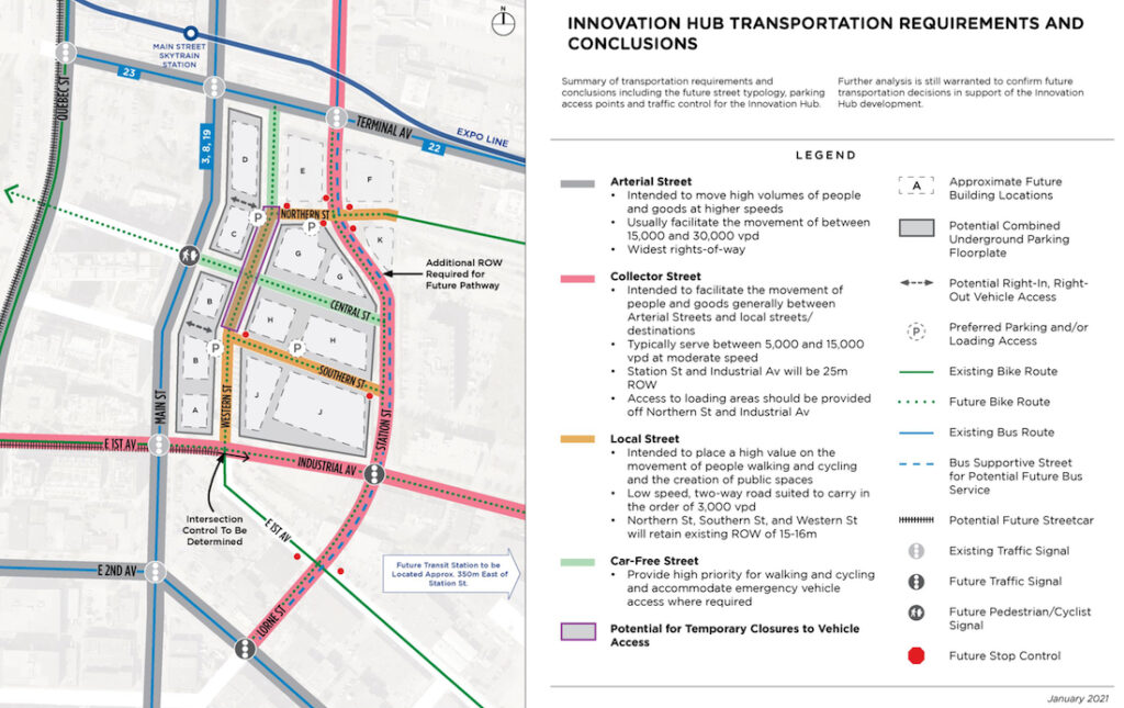 The fourth site at the southeast corner of Main Street and Terminal Avenue has been planned as an “Innovative Hub” under the City’s False Creek Flats Plan. A mix of innovation economy uses are envisioned, including laboratories, research and development, creative/light industrial, tech offices, arts and cultural facilities, local food economy spaces, some residential uses, and the active ground-level uses of retail and restaurants.